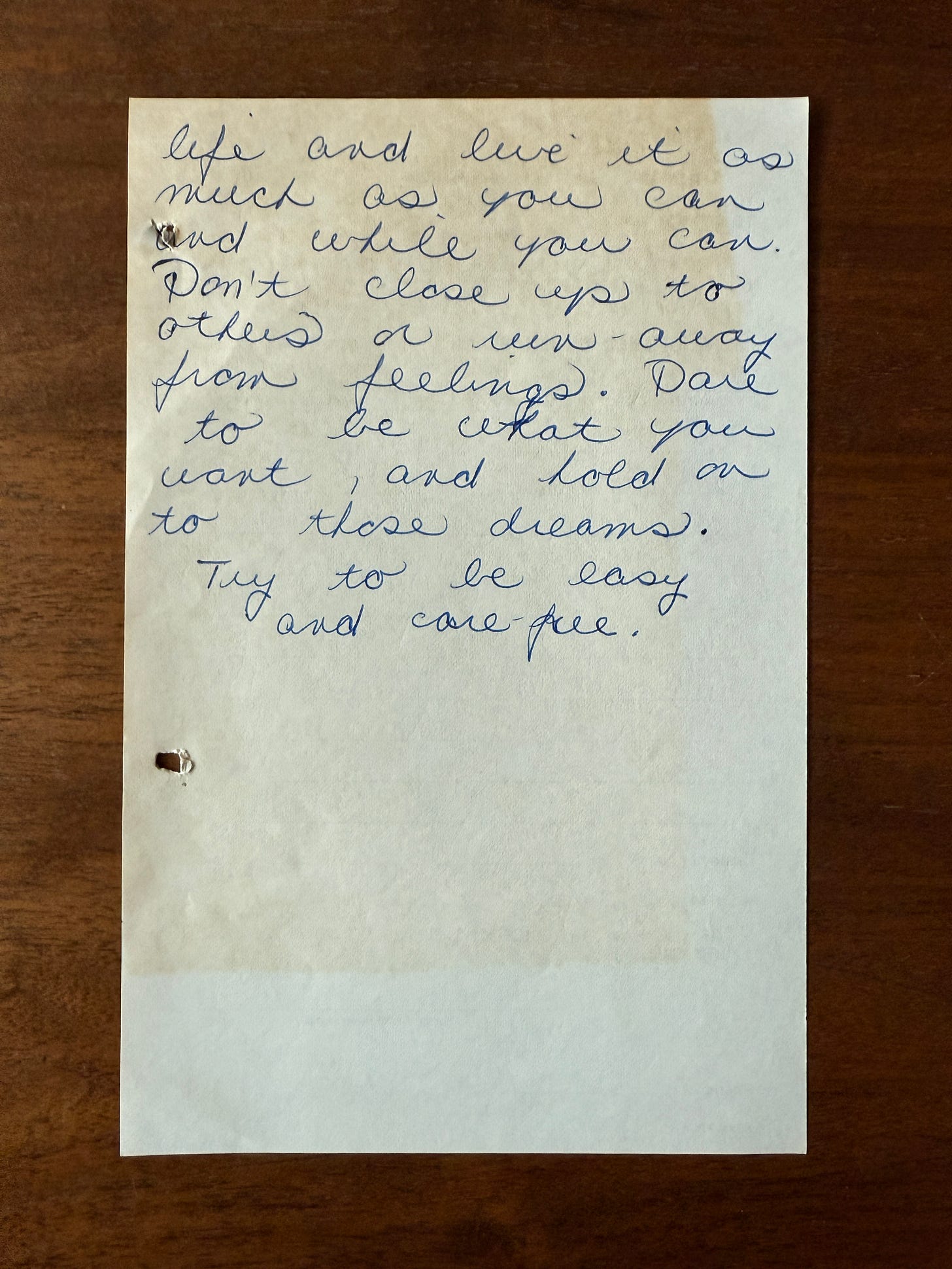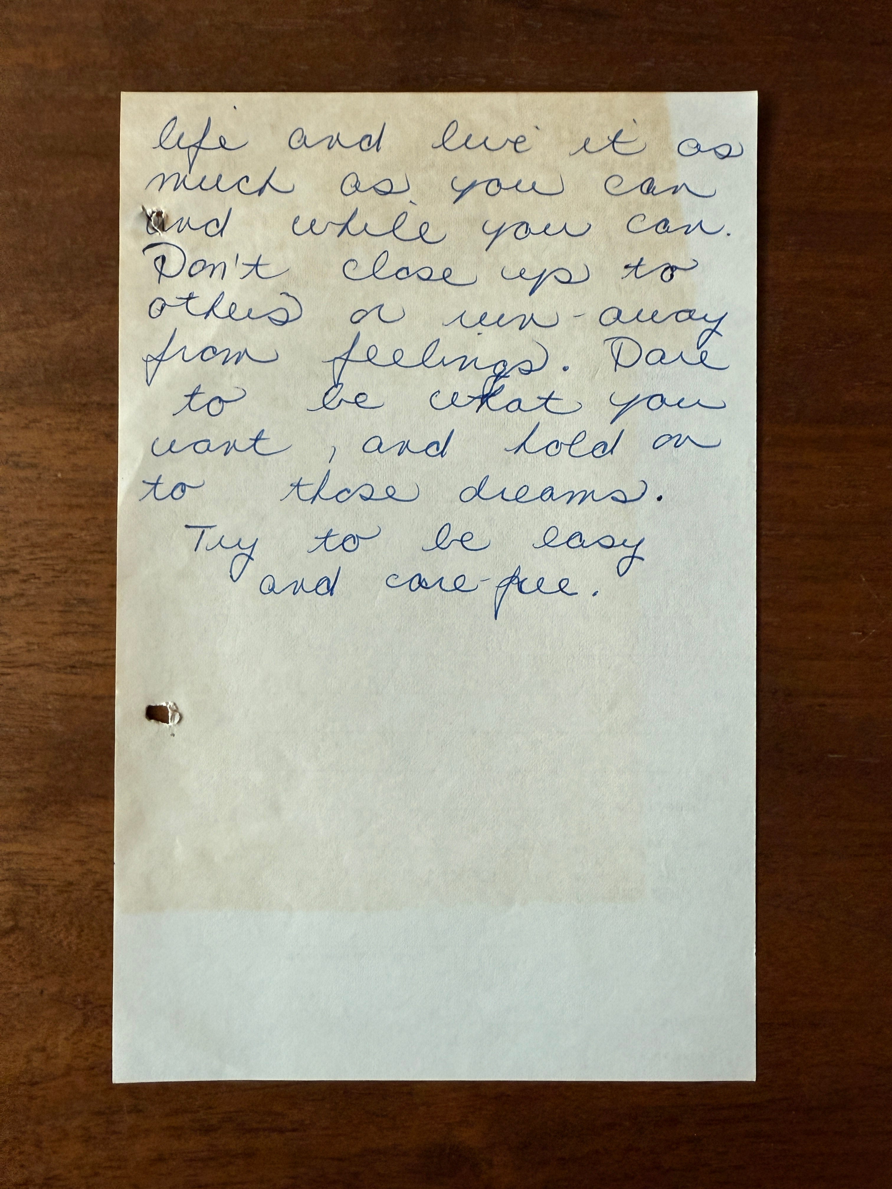 “Don’t close up to others or run away from feelings. Dare to be what you want, and hold on to those dreams. Try to be easy and carefree.”